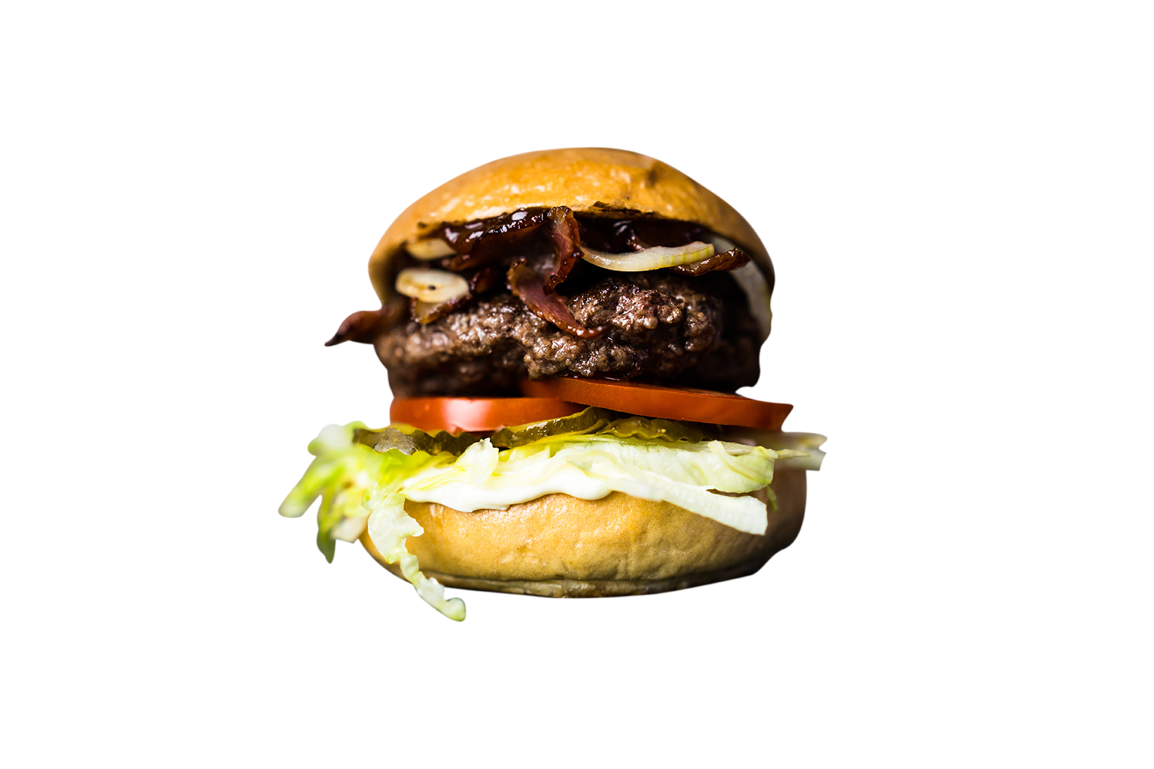 wołowina 100%, boczek, sałata, pomidor, ogórek konserwowy, cebula grillowana, sos: majonez, BBQ -